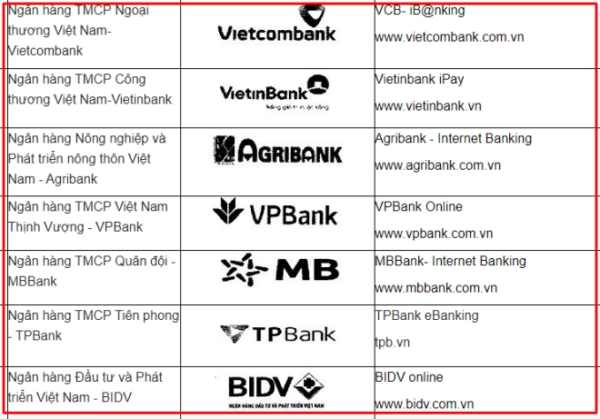 – Người nộp lệ phí trước bạ lựa chọn đăng nhập vào hệ thống thanh toán điện tử của một trong các ngân hàng theo danh sách dưới đây và thực hiện theo quy trình hướng dẫn nộp lệ phí trước bạ của ngân hàng: