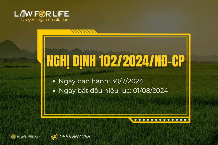 Nghị định 102/2024/NĐ-CP, được ban hành vào ngày 30/7/2024, là một văn bản quan trọng hướng dẫn chi tiết việc thi hành Luật Đất đai 2024. Nghị định này bao quát nhiều vấn đề liên quan đến quản lý và sử dụng đất đai, từ việc giao đất, cho thuê đất, đến việc chuyển đổi mục đích sử dụng đất, và giải quyết tranh chấp đất đai. Đặc biệt, Nghị định này đã đơn giản hóa các thủ tục hành chính, giúp người dân và doanh nghiệp dễ dàng tiếp cận các dịch vụ liên quan đến đất đai. Nghị định 102/2024/NĐ-CP bắt đầu hiệu lực từ ngày 01/08/2024.
